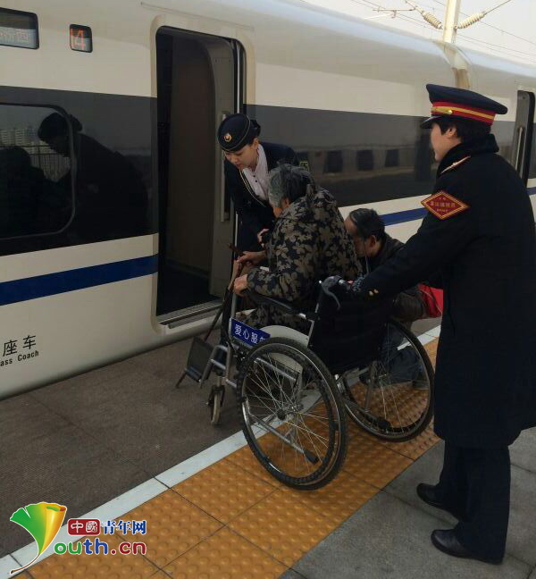 乘务组为行动不便的乘客安排轮椅,并联系到站工作人员将老人送下列车。 记者郭蕾 摄