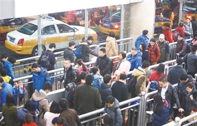 昨日,北京西站北广场地下出租车枢纽,乘客至少要排半个小时才能打到出租车。