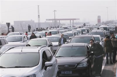 昨日,兰南高速河南段,堵在高速路上的汽车车主下车休息。 A04-A05版摄影/新京报记者 秦斌 浦峰 王贵彬 实习生 彭子洋