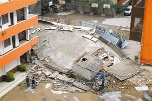 记者在现场看到,坍塌大楼仅剩三四米高,碎裂的水泥块冲倒原本围着大楼四周的挡板,散落在学校篮球场和过道上。教师宿舍楼二楼走廊围栏被刮碰变形,大楼旁的爱义大厦出现3个大洞。