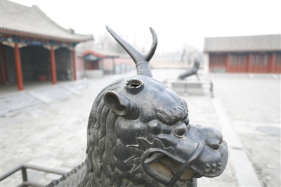 昨日,圆明园长春园宫门前,守门的一只铜麒麟头上,一只角齐根折断。新京报记者 浦峰 摄