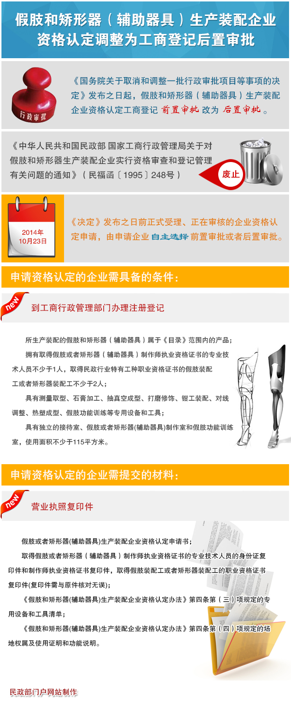 为贯彻落实《国务院关于取消和调整一批行政审批项目等事项的决定》(国发〔2014〕50号),改革假肢和矫形器(辅助器具)生产装配企业资格认定制度,民政部近日发布通知,将“假肢和矫形器(辅助器具)生产装配企业资格认定”由工商登记前置审批调整为后置审批,并就新的审批程序和要求作出了相应规定。
