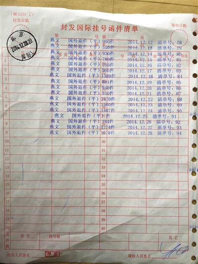 北京邮政公司出示的“清单”显示,国外邮件已退还给燕文公司。