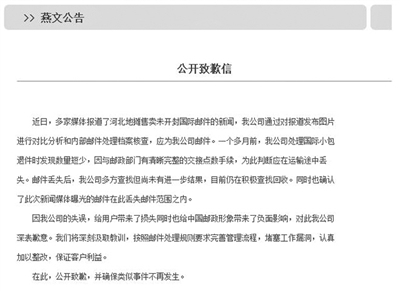 昨日上午,燕文公司在其官网发布公开致歉信,承认被出售邮件系该公司从邮政部门交接后,于运输途中丢失。燕文公司总经理周文兴表示,目前已对公司涉事司机做出罚款1000元、调离岗位的处罚。