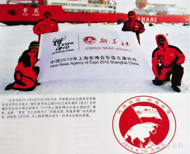 当年,我之所以得到代表分社签名售书的殊荣,是因为在世博会期间,我参加了中国第4次北极科学考察。根据慎海雄社长策划,在国家海洋局极地办和全体考察队友大力支持下,我们乘坐“雪龙号”进入北极圈的时候,组织了“祝福祖国、问候世博”活动。那次考察中,我还有幸和部分队友乘坐直升机抵达北极点。那是中国考察队第一次抵达北极点考察,我也成为新华社历史上第一位抵达北极点采访的女记者。我将世博会的会旗插上了北极点。这也是历史上世博会旗帜第一次插上了地球的最北端。为了留下永远的纪念,分社专门制作了“北极点世博印章”,为世博文化增添了前所未有的“北极点元素”。