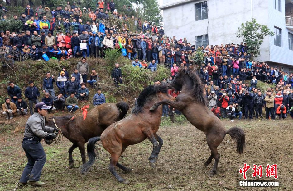 3月3日,广西融水苗族自治县安太乡十三坡苗寨举行传统斗马迎元宵,来自当地的32匹勇驹进行激烈争斗,吸引数千群众观看。 中新社发 谭凯兴 摄 图片来源:CNSPHOTO