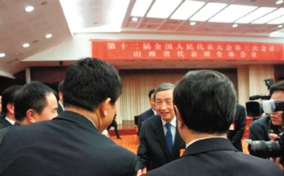 全国人大代表、国务院副总理马凯(中)参加山西团审议,与代表握手。图据南方都市报