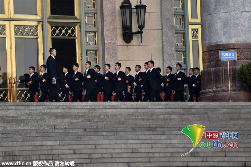 2015年3月5日,中国北京,2015年全国两会在北京召开。北京人民大会堂,黑衣人安保整齐列队行进,步伐统一。