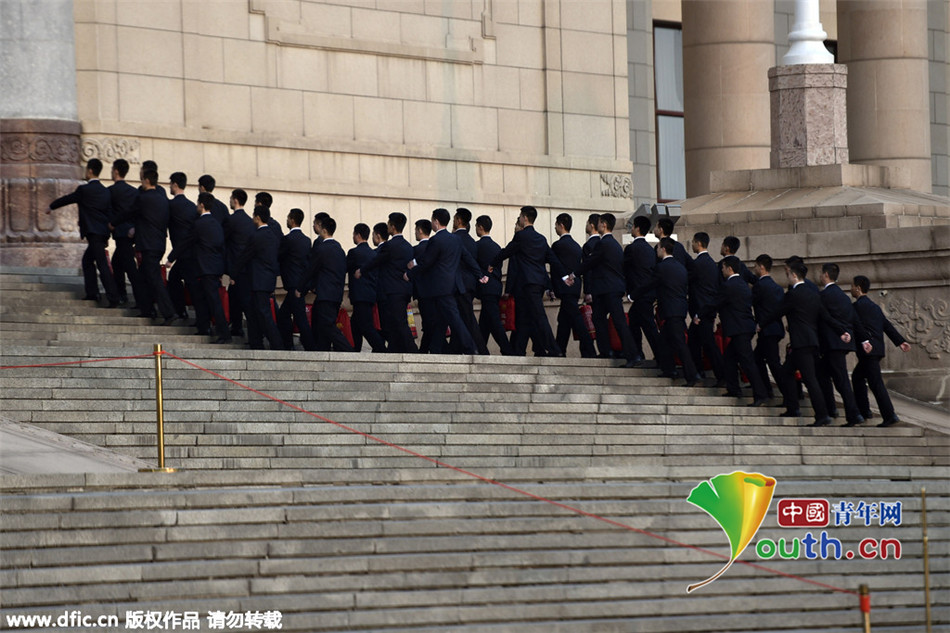 2015年3月5日,中国北京,2015年全国两会在北京召开。北京人民大会堂,黑衣人安保整齐列队行进,步伐统一。
