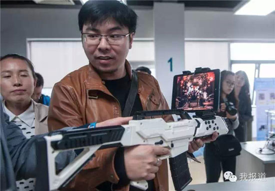 图为2014年12月11日,在中国科学院深圳先进院,一名“创客”展示用平板电脑连接的枪形游戏“手柄”。毛思倩摄影