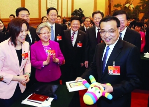 “这是我们的奥运冠军葛菲。”会前,在跟代表一一握手时,听到罗志军的介绍,李克强停了下来,与葛菲代表握手。葛菲自我介绍说:“我是羽毛球运动员,参加过两届奥运会,您在政府工作报告中充分肯定了南京市成功举办青奥会,感谢您,我特地从南京给您带来了青奥吉祥物砳砳和有南京特色的纪念章,送给您,祝您吉祥如意。”总理接过礼物,笑着说:“好啊好啊,那我要放在办公室。”