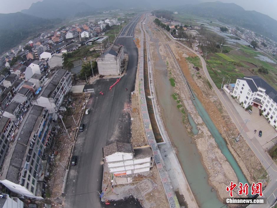 3月10日,在41省道南复线溪南村处,2栋房屋耸立在一条新建好的路中央,给车辆通行带来安全隐患。中新社发 长空 摄 图片来源:CNSPHOTO