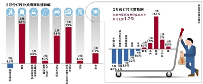 昨天,北京市统计局、国家统计局北京调查总队发布的数据显示,2月份北京市居民消费价格(CPI)总水平同比上涨1.7%,不但触底回升,比上月涨幅扩大了1.3个百分点,而且达到了7个月来的最高涨幅。
