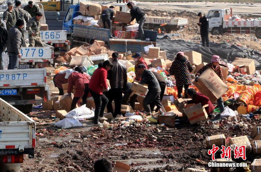 2015年3月11日消息,江苏徐州,昨天下午,由市政府统一组织,工商、公安、商务、质监、食药等执法部门联合在市雁群生活垃圾填埋场实施假冒伪劣商品集中销毁行动。本次销毁的假冒伪劣商品涉及食品、保健品、洗化用品、电线电缆、计算机配件等共计35.7吨,案值28.5万元。亚明 摄 图片来源:CFP视觉中国