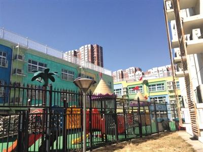 昨日下午,记者来到北辰福第幼儿园,黑色的铁栅栏将彩色的幼儿园建筑团团圈住,铁栅栏的另一边,是栋三层白楼。不规则的栅栏将幼儿园与白楼一分为二,幼儿园教学楼的楼顶四周竖起高高的围栏。有家长透露,因场地不足,孩子们的活动场所曾被转移到屋顶上。紧邻幼儿园操场的白楼就是朝阳区住房保障事务中心。