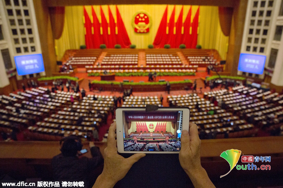 2015年3月12日,北京,2015年全国两会在北京举行。上会代表、委员及工作人员在人民大会堂前拍照留念,人民大会堂内外变“影棚”。 人大代表在会场内用苹果iPad mini拍摄大会盛况。