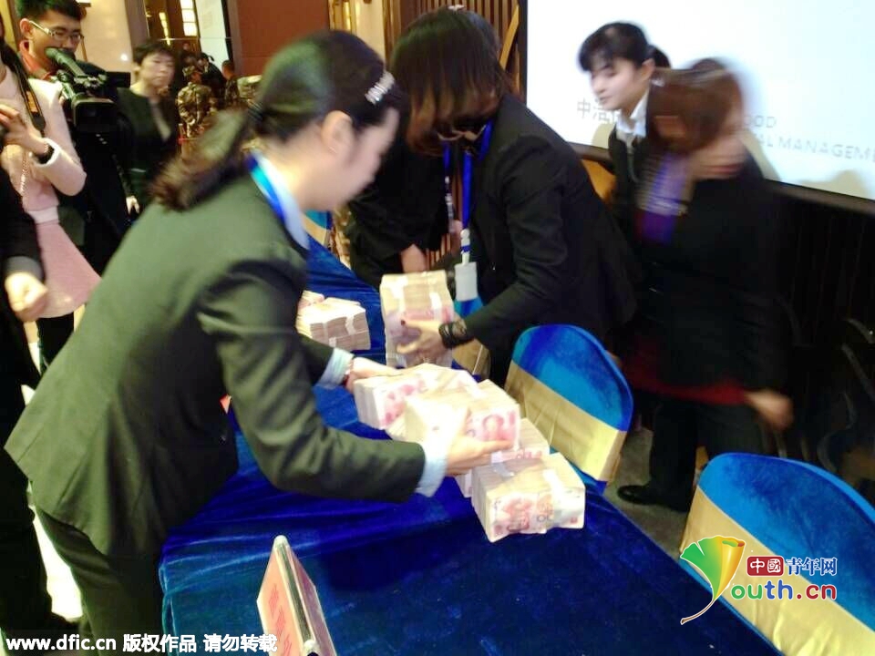 2015年3月11日,河南省洛阳市一家楼盘开发商总部员工活动中心内,现场主席台上访摆放了成捆人民币。这是该楼盘推出的“全民合伙人”营销计划,现场,该楼盘将1000万元分红基金提前发放给合伙人,用于激励合伙人。