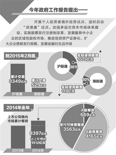 沪港通于2014年11月正式启动后,市场交易活跃。到今年2月底,沪港通累计交易3349亿元,港股通累计交易529亿元。沪股通实际使用额度1073亿元,占初始总额度的36%;港股通使用额度119亿元,占总额度的10%。共有97家香港券商参加了沪股通交易,89家国内交易所参加了港股通交易,国内投资者开户数约50万户。
