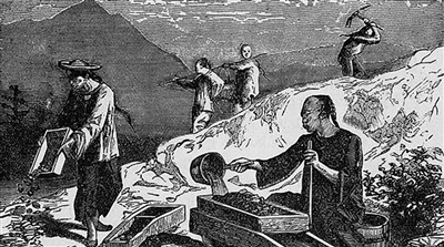 图为刻画早期华工工作场景的雕版画。