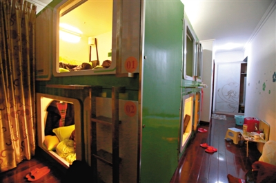 这家胶囊公寓由四室一厅改装而成,面积约170平米,装修同普通住家相同,客厅内放有冰箱、电视、沙发等,每个房间内则放有数目不同的上下铺,它们被半封闭着,外形有些像“胶囊”。