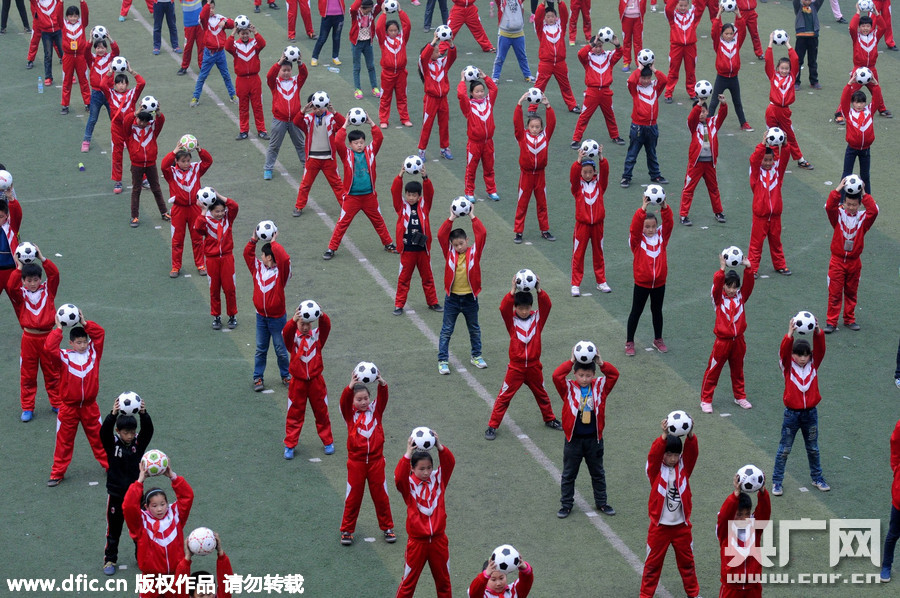 2015年3月16日,在河南省洛阳市涧西区景华路实验小学的操场上,同学们正在练习学校老师自编的足球操。据了解,自从校园足球上升为国家战略后,该学校开始自编足球操,准备在大课间推广足球操,推进校园足球普及,促进青少年强身健体、全面发展。