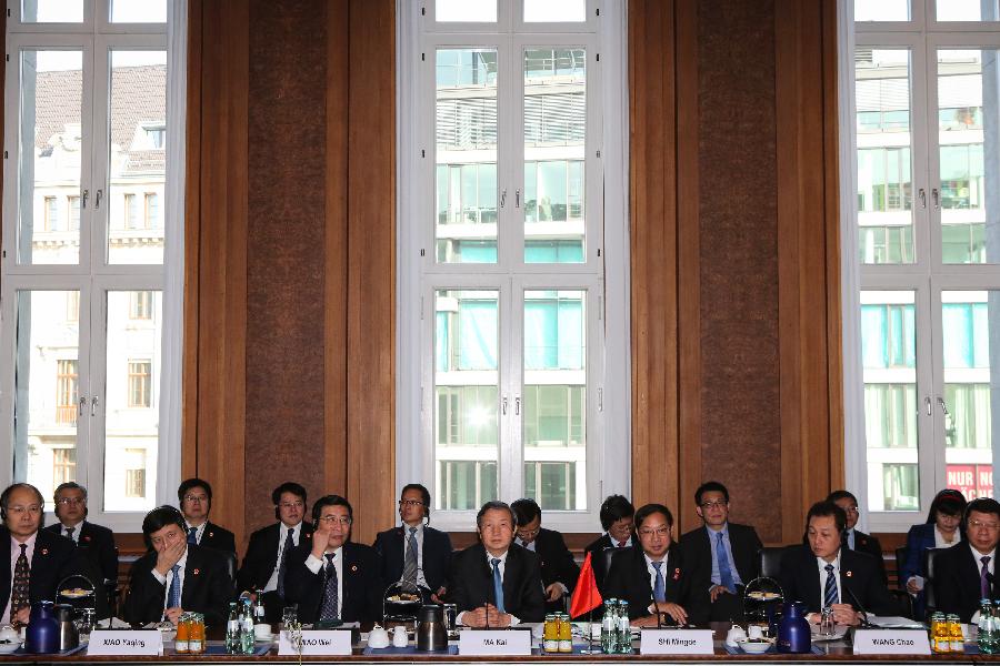 3月17日,在德国柏林,中国国务院副总理马凯(前排中)出席中德高级别财金对话。当日,首次中德高级别财金对话在德国柏林举行,中国国务院副总理马凯与德国财政部长朔伊布勒共同主持、德央行行长魏德曼出席会议。双方围绕“促进具有前瞻性及互惠互利的中德财金关系”的主题,就宏观经济、中德战略性合作方向、金融稳定、地区和国际经济合作等议题进行深入沟通,取得积极成果。新华社记者张帆摄