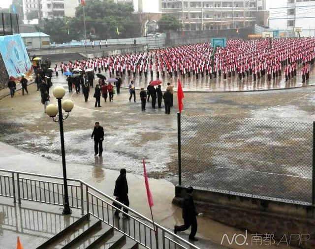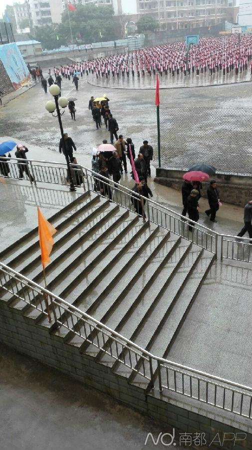在网友上传的图片中可以看到:现场撑起近10把雨伞,其中有一位领导模样的人,其背后有人为其打伞,前面还有人指着做操的学生介绍情况,操场旁边有人匆匆离开。