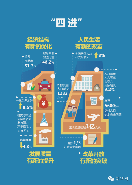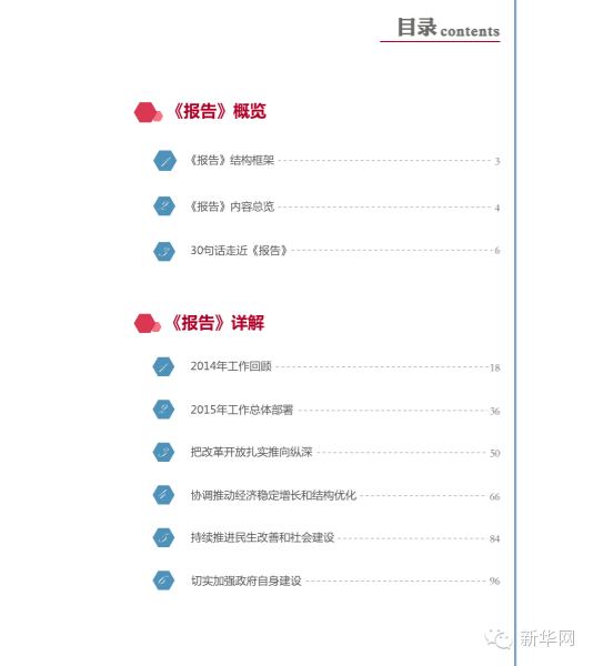 接下来,就进入了《报告》详解部分,包括 2014年工作回顾、2015年工作总体部署、把改革开放扎实推向纵深、协调推动经济稳定增长和结构优化、持续推进民生改善和社会建设、切实加强政府自身建设六个部分。