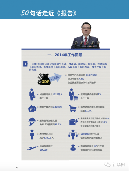 《报告》概览中有一板块小微最是喜欢,叫作“30句话走近《报告》”。内容是干货中的干货不说,可读性还很强,有图例、有数据,让你在不知不觉中就跟着总理看遍2014年政府全年工作情况,读懂2015年政府总体工作部署和重点任务。