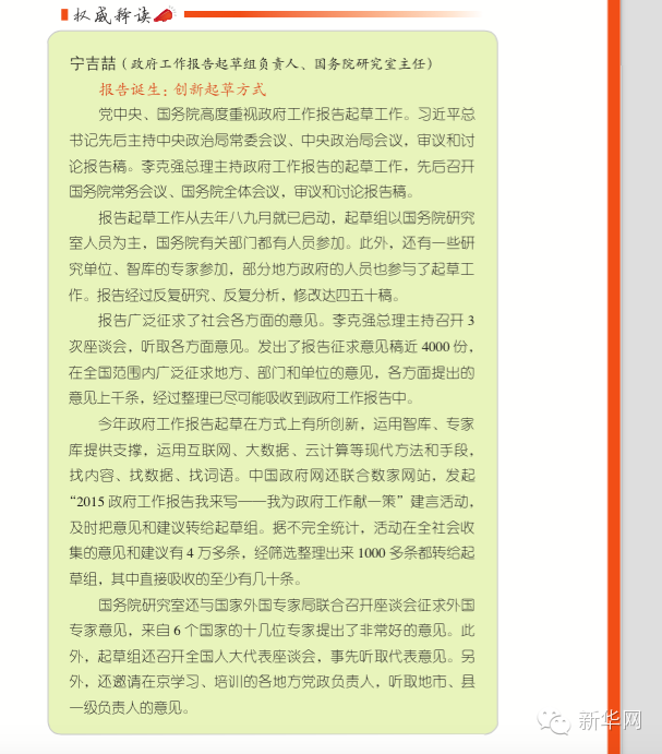 书里还提供了来自政府工作报告起草组负责人宁吉喆以及各部委部长等人提供的对政府工作报告相关部分的权威解读。高大上的《政府工作报告》是如何诞生的?如何看待 2014 年国内生产总值增长 7.4%?2015年GDP 7%左右是预期还是指令?这些只知其一,不知其二的问题,就和小微一起看“权威解读”吧。