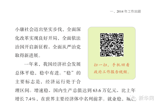 了解了《报告》详解部分的总体布局,咱们继续翻页,一个二维码映入眼帘。微信扫一扫,就可以重温李克强总理政府工作报告啦。这就是全媒体的魅力啦。