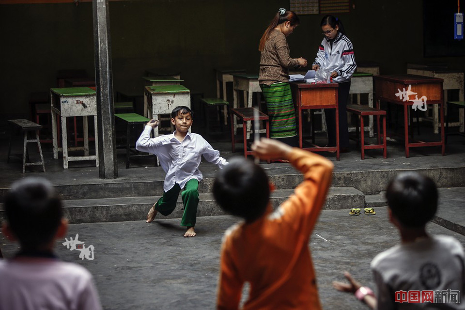 随着学校规模越来越大,越来越多瑞丽当地的孩子来到学校学习缅语。现在学校每天早上8点到下午5点是缅籍学生上课,开设中国语文、缅甸语文、数学、英语、音乐、美术、电脑等课程,教学阶段从学前班到9年级。下午5点以后则是中国学生学习缅语的时段。图为在学校内玩耍的缅甸学生。