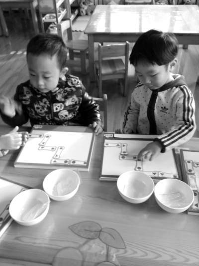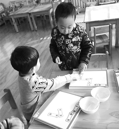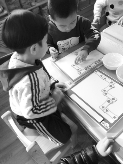 恒恒还是不太认同,依旧按照老师的摆法玩。谁知坐在一旁的昊昊看了木木的佳作后,立即模仿起来(见图一)。