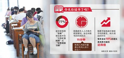“今天你读书了吗?”一次面向全国的调查中,有77%的被访者选择了“没有”,理由则集中在“工作忙没时间”或“没有阅读习惯”。阅读出了问题已经是不争的事实:不仅民众每年的阅读量不足,甚至不到有些国家人均的十分之一,而且很多人觉得刷微信刷微博、读段子看漫画,有这样的阅读也就够了。有人概括这样的阅读方式是“屏不离身”的浅阅读。