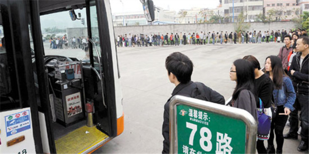 近日,广州岑村公交总站市民排队上78路公交的照片被热转,被网友赞誉为“广州式排队乘车”。在工作日的早上8:15,记者在78路岑村公交总站看到,超过100米的候乘队伍在站内整整齐齐地绕了一个圈,没有一人插队。图为岑村公交总站,市民排队上车。