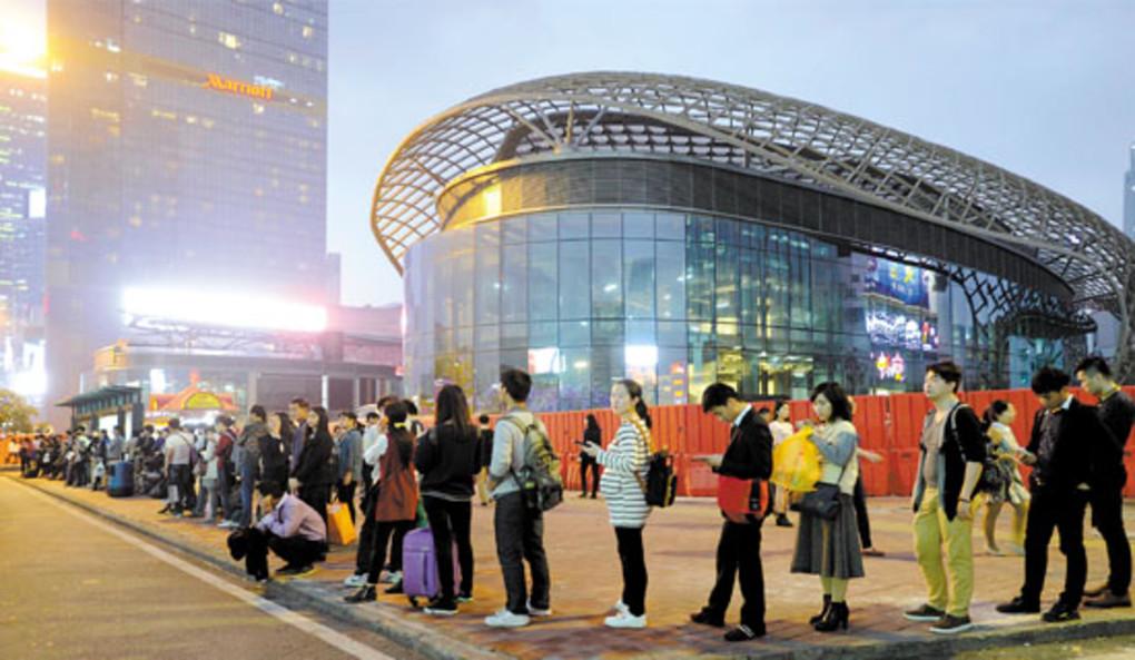 近日,广州岑村公交总站市民排队上78路公交的照片被热转,被网友赞誉为“广州式排队乘车”。在工作日的早上8:15,记者在78路岑村公交总站看到,超过100米的候乘队伍在站内整整齐齐地绕了一个圈,没有一人插队。图为岑村公交总站,市民排队上车。