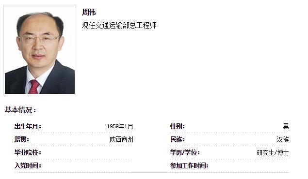 据交通运输部网站“部长网页”栏目显示,周伟于2015年3月任交通运输部总工程师(正局级)。据了解,周伟此前任交通运输部公路科学研究所所长、党委副书记。 (崔小粟)