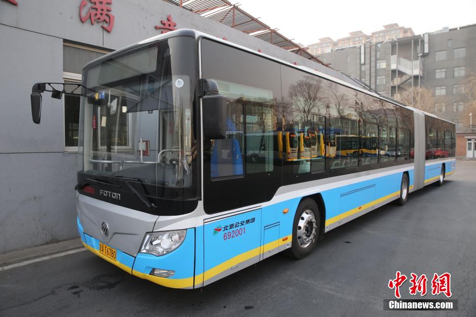 3月25日,国内首辆18米长纯电动公交车在北京正式开始载客。记者获悉,该辆纯电动公交车的载客能力是一般公交车的两倍,有助缓解高峰时段的上下班客流。中新社发 熊然 摄