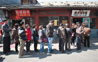 24日,新老顾客得知新成削面馆即将关门,排队体验“老北京味道”。实习生 彭子洋 摄
