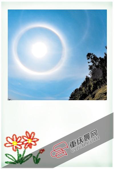 昨日中午,众多游客在巴南区跳石镇海拔千米的五洲生态园里也拍下了日晕的美景,大家惊呼:“彩虹把太阳围了一个圈!”据记者观察,这个泛着红、橙、黄、绿的大圈持续了大约15分钟。