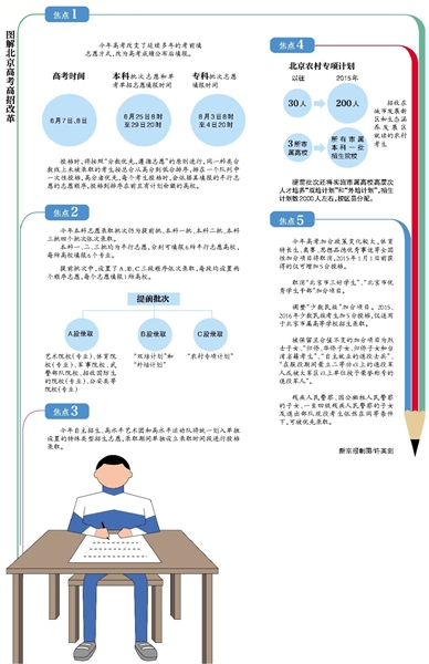 继去年国务院和教育部发布高考改革方案之后,北京市2015年高招方案昨日正式落地,北京市招生考试委员会审议通过了《关于做好北京市2015年普通高校招生工作的通知》和《北京市2015年普通高等学校招生工作规定》等文件。