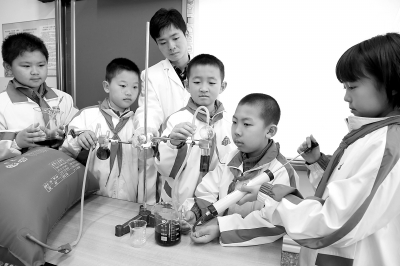 3月27日,青岛科技大学化学系大学生志愿者来到青岛市宁安路小学,指导小学生通过实验分解空气中的雾霾成分,教育小学生“寻回蓝天”做环保小卫士。