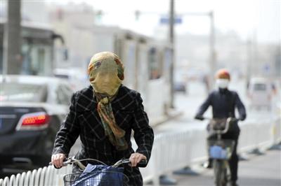 昨日,珠市口东大街,出行的市民或围面纱或戴口罩。当天,北京遭遇沙尘天气。记者 王嘉宁 摄
