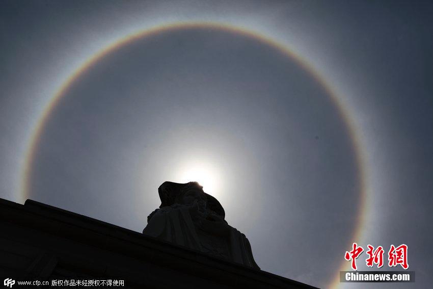 2015年03月29日,三亚,当日中午,海南多地出现日晕奇观,三亚南山佛教文化苑景区108米海上观音像被巨大的日晕光环包,该现象持续一个小时左右,引来众多游客仰望、拍照。陈文武 摄 图片来源:CFP视觉中国
