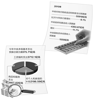 今年中央本级基本支出预算总额为9375.71亿元,按照经济分类包括3大类,即工资福利支出为3712.1亿元、对个人和家庭的补助2196.59亿元、商品和服务支出3467.02亿元。由于财政支出预算科目一般分为“类、款、项、目”4个级别,此次报告对基本支出也细化到款级科目。上海财经大学教授邓淑莲表示,基本支出按经济分类编制“吃饭预算”,更直观体现政府具体花这笔钱干了什么。