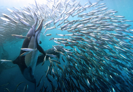 这组照片拍摄于南非东海岸,900万沙丁鱼团成球状向前游动,以此建立防御机制,但也难以逃脱被鲨鱼、海豚、鲸鱼等大型海洋哺乳动物以及鸟类当做盘中盛宴的命运。