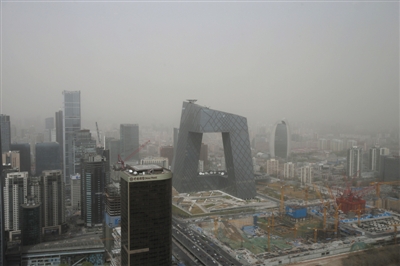 3月28日,北京遭遇今年首个沙尘天气,东三环周边建筑被黄色沙尘笼罩。新京报记者王贵彬摄