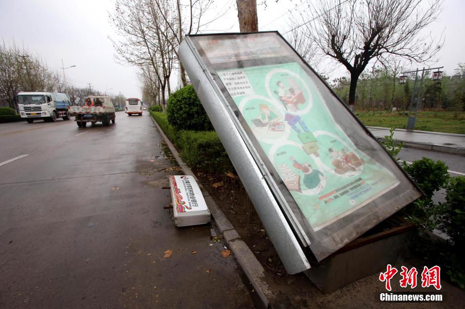 4月1日,开封市街头被大风刮倒的物体。随着一场大风和降雨,河南省开封市气温骤降,天气显得非常寒冷,让街头行走的人冻的直打哆嗦;随着大风袭来,市区内广告牌、垃圾箱等许多物体被大风刮倒或损坏,显得一片狼籍。中新社发 李俊生 摄 图片来源:CNSPHOTO