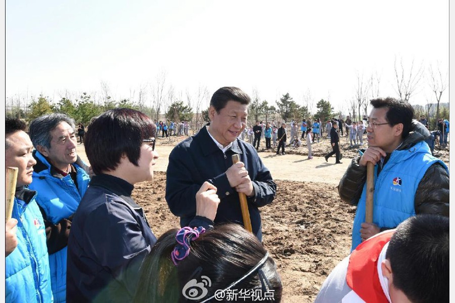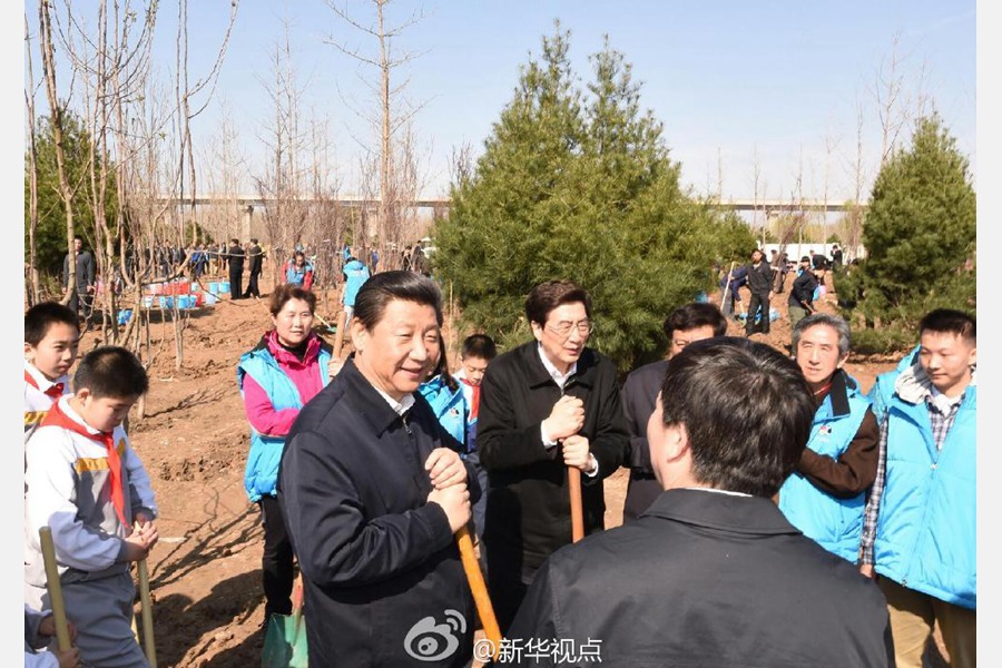 新华网北京4月3日电 据新华社“新华视点”微博报道,3日上午,习近平来到北京市朝阳区孙河乡参加首都义务植树活动。他强调,坚持全国动员、全民动手植树造林,努力把建设美丽中国化为人民自觉行动。李克强、张德江、俞正声、刘云山、王岐山、张高丽参加植树。