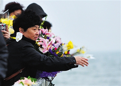 在轮船一层的甲板上,参加共祭的市民手捧菊花花瓣撒向大海,向骨灰海葬于此的亲属寄托哀思。市民李淑敏和妹妹撒完花瓣后,分别放飞一只鸽子。“爸爸,我们来看您了。”她们凝视大海深处说道。